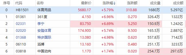 华盛资讯6月18日消息,体育用品早盘强势上涨,截止发稿,361度上涨6.96%;李宁上涨6.69%;安踏体育上涨5.74%;特步国际上涨4.98%,李宁、安踏、特步均刷新历史高价;滔博上涨3.79%;中国动向上涨1.74%。