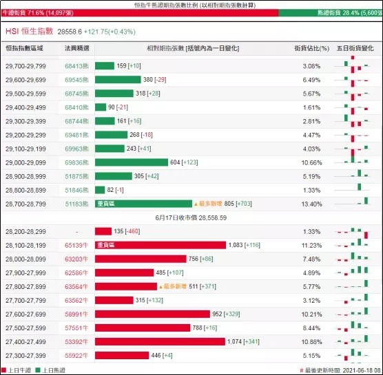 街货分布方面,至周四,恒指牛证街货重货区在收回价27800点至28300点之间,累计相当约2970张期指合约;恒指熊证街货重货区在收回价28700点至29100点之间,累计相当约1796张期指合约。