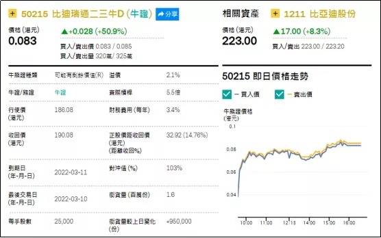 1、强势轮证:比迪瑞通二三牛(50215.HK),周四上涨50.9%;