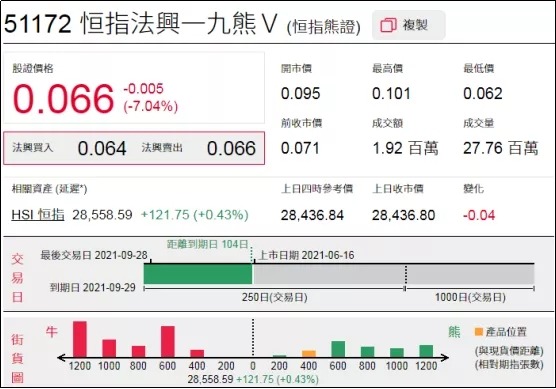 2、看错方向:恒指法兴一九熊(51172.HK),周四下跌7.04%。