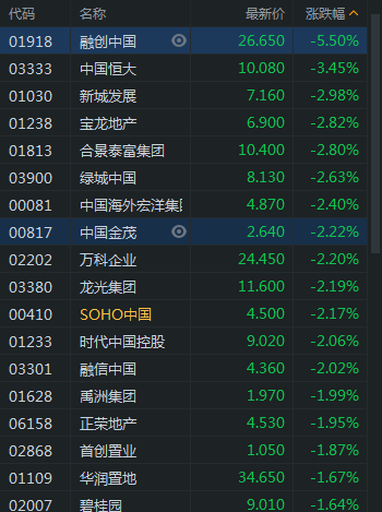 6月18日消息,内房股集体走低,融创中国跌近6%,中国恒大跌3.45%,新城发展、宝龙地产、合景泰富跌近3%,SOHO中国跌2.17%,碧桂园跌1.64%。