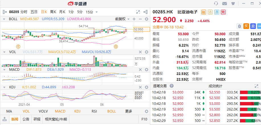 华盛资讯6月18日消息,比亚迪电子日前发布公告称,公司为荣耀50手机提供了整机组装服务,全力打造荣耀公司成立后正式上市的首款数字旗舰手机。比亚迪电子承接了荣耀50手机SMT、组装、测试、包装等全流程加工生产。今日比亚迪电子一度涨超5%,截止发稿,比亚迪股份上涨4.44%,现报每股52.900港元,总市值1192亿港元,成交额2.807亿港元,换手率0.249%。