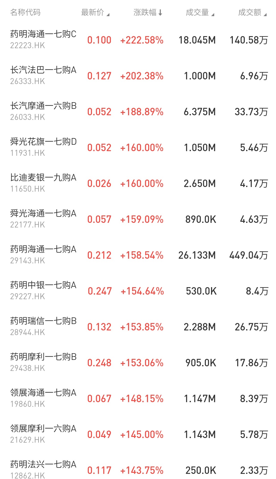 涨幅居前的包括:药明海通一七购C暴涨222.58%;长汽法巴一七购A涨202.38%。其中,比亚迪股份强势上涨逾9%,超十只购证涨幅在100%以上。