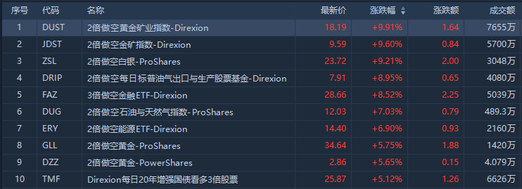 受消息影响,今日涨幅居前的ETF主要有2倍做空黄金矿业指数的DUST涨9.91%,成交额7655万美元;2倍做空每日标普油气出口与生产股票基金的DRIP涨近8.95%,成交额4080万美元;Direxion每日20年增强国债看多3倍股票涨5.12%,成交额6626万美元。