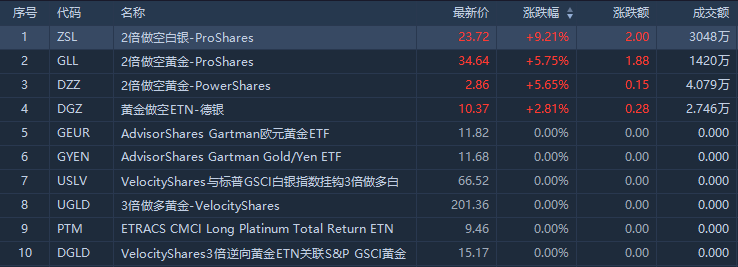 涨幅居前的有2倍做空白银的ZSL涨9.21%,成交额3048万美元;2倍做空黄金的GLL涨5.75%,成交额1420万美元。