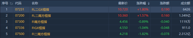 今日涨幅位居前的ETF有GX中国电车ETF涨3.96%,成交额1.05亿港元;南方两倍做多恒科涨3.83%,成交额9000万港元;此外,还有GX中国半导ETF涨3.97%,成交额3607万港元。