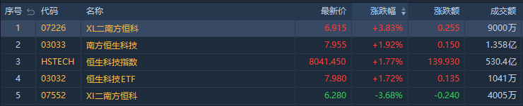 看多恒指相关ETF走强,南方两倍做多恒科(07226.HK)涨3.83%,成交额9000万港元;