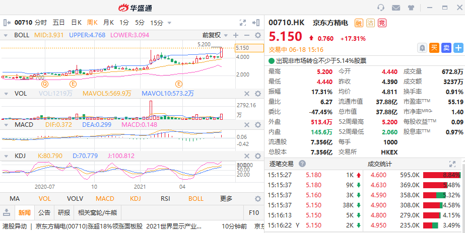 华盛资讯6月18日消息,今日京东方精电涨超17%,截止发稿,京东方精电上涨17.31%,现报每股5.150港元,总市值37.88亿港元,成交额3237万港元,换手率0.91%。