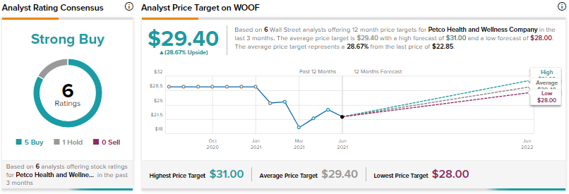 财报发布后,富国银行分析师Zachary Fadem重申了对该股的“买入”评级,目标价30 美元。Fadem 表示,Petco Health超预期的一季度业绩证实了其在行业中的竞争力。基于 5 个买入评级和 1 个持有评级,华尔街对Petco Health的共识评级为强烈买入,分析师给出的平均目标价为 29.40 美元,意味着相对于当前水平有近30%的上涨潜力。