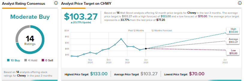 财报发布后,富国银行分析师Brian Fitzgerald大幅上调了对Chewy的目标价,提高至 120 美元(上涨 55.4%)。基于 10 个买入评级和 4 个持有评级,华尔街分析师对Chewy的平均目标价为目标价为 103.27 美元,意味着相对于当前水平有大约 33.7% 的上涨潜力。