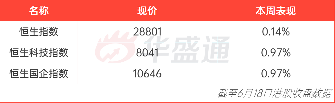 恒生指数本周跌0.14%,报28801;恒生科技指数本周涨0.63%,报8041;国企指数本周跌0.97%,报10646。