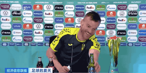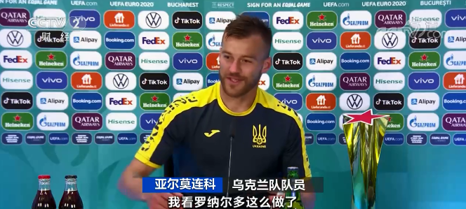 乌克兰队队员 亚尔莫连科:我能做点什么吗?我看罗纳尔多这么做了,我要把可口可乐放在这里,把喜力挪到这边,所以有广告需要拍摄的话,一定要记得联系我。