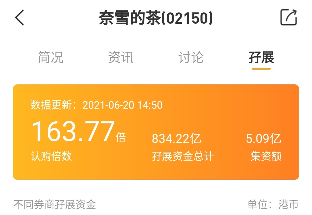 奈雪的茶目前申购火爆,截止发稿,孖展暂录得834亿港币,超购逾162倍,将于下周三结束招股,29日公布中签结果。前往申购奈雪的茶>>