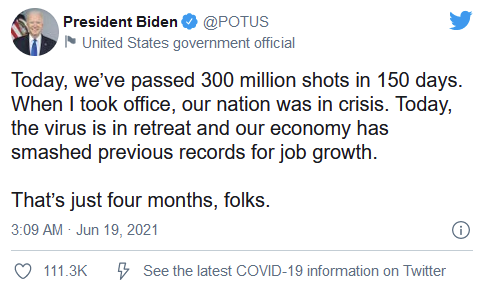 与过去的里程碑一样,拜登总统在他的Twitter账户上指出了最新的里程碑,最终大大超过了他的原始目标,同时接近了他的最新目标:在独立日之前为70%的成人接种至少一剂COVID-19疫苗。