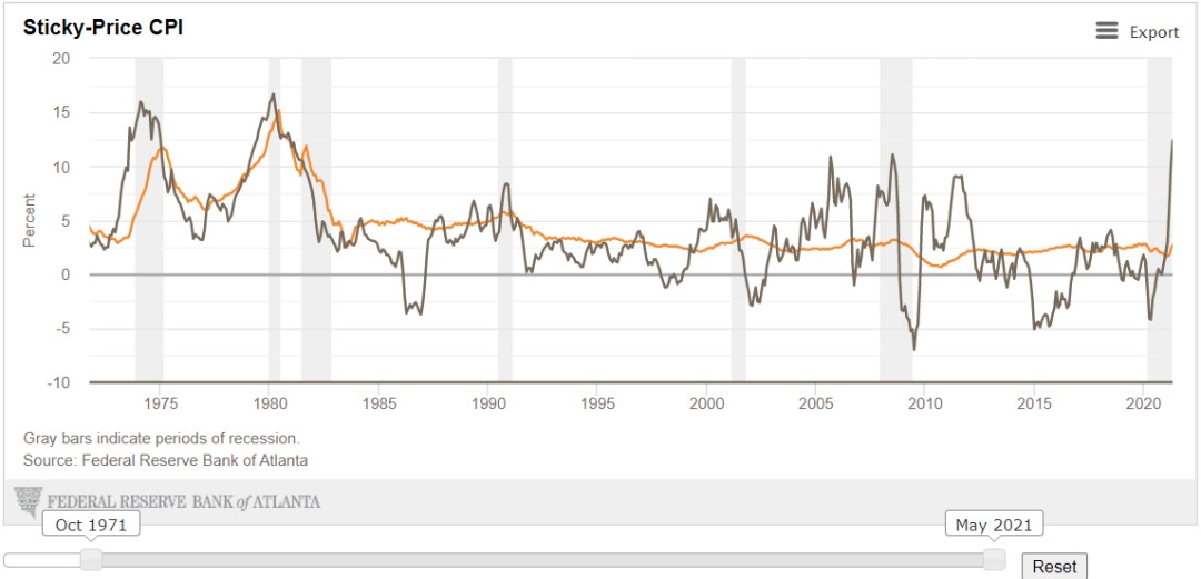 有意思的是,亚特兰大美联储的Sticky CPI和Flexible CPI的公布时间是整体CPI数据公布当天美东时间11点,比整体CPI数据的公布时间8:30晚两个半小时,这也造成了上周四当天美股大盘的剧烈波动。因为5月 Sticky CPI的环比增长率比4月有所放缓,是当前通胀上涨是暂时的有力佐证。