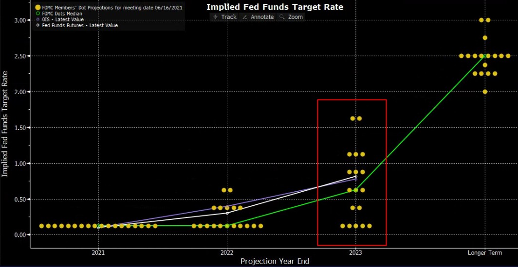 最让市场感到“鹰”的地方,是美联储经济数据预测总结(SEP)中,提高了对通胀和GDP增长的预测值,以及将加息点阵图前移到了2023年加息两次。