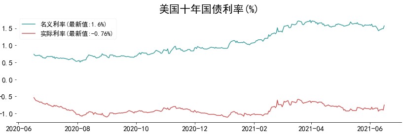 在美联储提高了通胀预测值后,出现了一个非常有趣的现象,即美国十年国债利率回升的同时,实际利率以更快的速度上行,直接结果是代表通胀预期的盈亏平衡率进一步下滑。