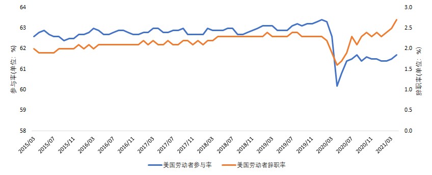 月初非农数据再次不及预期,也许给了人们美国就业市场仍远远没有恢复到疫情前的错觉,但实际情况是冰火两重天:一方面是工作岗位空了一大堆,另一方面是美国人因为不工作也能拿财政刺激的钱,劳动者参与率远小于疫情前,辞职率还上升至5年新高。这两种情况都导致了工资有持续上涨的压力,从而推升服务业的通胀水平。