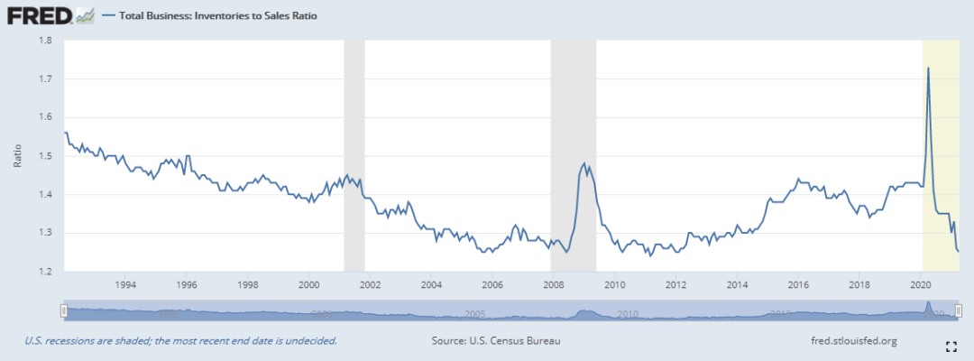疫情带来的全球供应链紊乱,使原材料的需求与供应存在地域错配,造成大宗商品价格相比年初涨幅巨大。能源类商品今年以来上涨了40%以上,对CPI的能源分项贡献巨大;而木材价格的上涨,则降低了房地产开发商建新项目的意愿,使房价居高不下,进而抬升房租以及房屋装修的成本。根据美国统计局的数据,全美库存销售比截至四月底已跌至30年低位。
