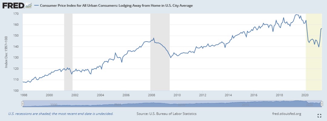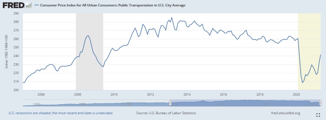 疫情复苏带来的服务业需求提升,尤其是旅游、出行和娱乐需求的井喷,与美国就业市场职位空缺问题造成的错配,抬升了包括公共交通、二手车、外出餐饮和离家住宿等CPI分项的价格。