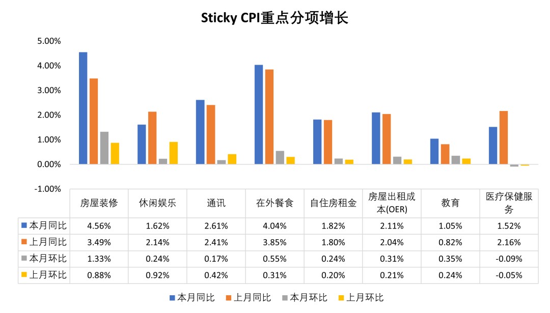 再看看在Sticky CPI中权重在2%以上的分项最近的同比与环比增速:半数Sticky CPI的重点分项的同比增长,目前并没有超过2%的美联储平均通胀目标。