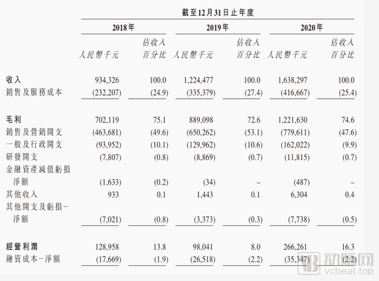 营收数据也是一大亮点。招股书显示,雍禾植发的总收入从2018年的9.34亿人民币增长到2019年的12.2亿人民币,增幅为31.1%,2020年总收入继续攀升,达到了16.4亿人民币,同比增幅为33.8%。而毛利方面,2018年到2020年皆维持在了70%以上的高位上。