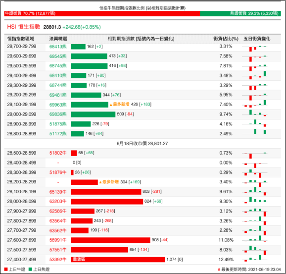 街货分布方面,至上周五,恒指牛证街货贴价区间主要在收回价27400点至27800点之间,累计相当约2835张期指合约;恒指熊证街货在收回价28800点至29300点,累计相当约1307张期指合约。