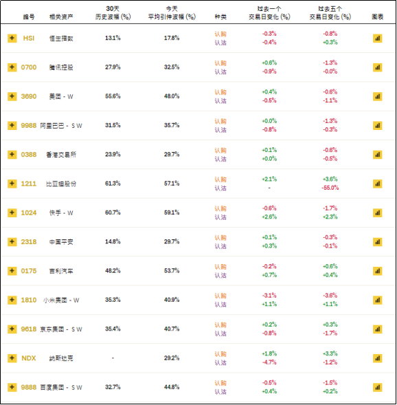 上周五恒指相关权证的平均引伸波幅报约17.8%。个股方面,比亚迪股份相关认购证的引伸波幅调升约2.1%,快手相关认沽证的引伸波幅上升约2.6%。