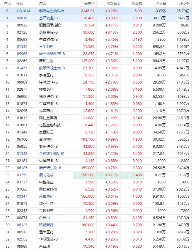 华盛资讯6月21日消息,生物制药板块普涨,截止发稿,基石药业-B、顺腾国际控股、药明巨诺-B涨超8%;中国抗体-B上涨5.45%;三生制药、康宁杰瑞制药-B涨超4%;药明生物、欧康维视生物-B、泰凌医药涨超3%;诺诚建华-B、神威药业等涨超2%。