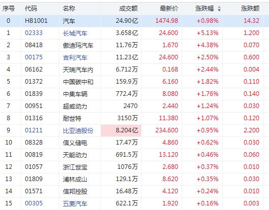 华盛资讯6月21日消息,港股汽车板块今日早盘走跌,现板块回涨走强。截止发稿,长城汽车涨超5%;傲迪玛汽车涨超4%;吉利汽车涨超2%;天瑞汽车内饰涨超2% ;比亚迪涨0.95%。