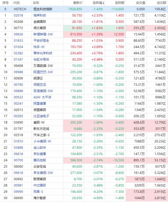 瑞声科技上涨2.53%;金蝶国际、阅文集团、哔哩哔哩-SW、平安好医生涨超1%。