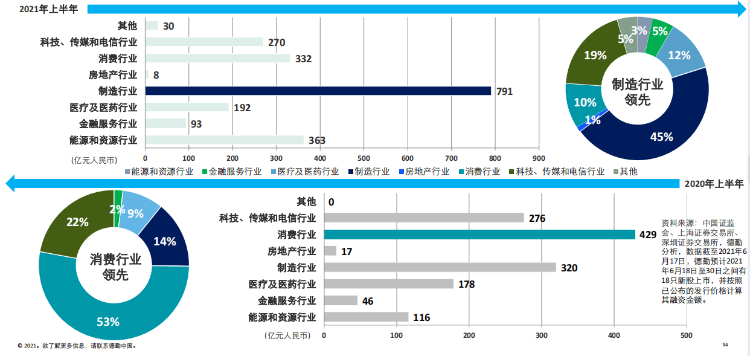 香港新股市场方面,因更多第二上市和不同股权架构新股上市,2021年上半年香港新股融资总额上涨超1倍,但是新股数量则下降。2021年上半年新经济新股数量及融资总额双双增加,当中有更多消费行业新股包含新经济元素。