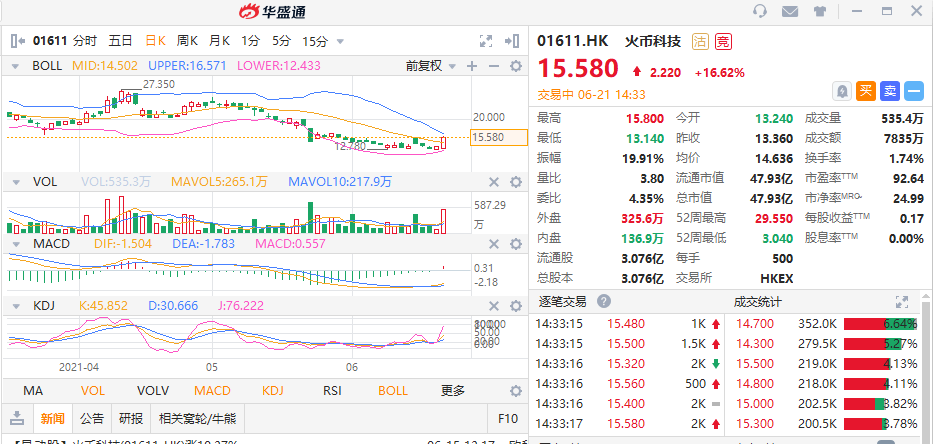 华盛资讯6月21日消息,今日午盘火币科技涨超16%,截止发稿,火币科技上涨16.62%,现报每股15.580港元,总市值47.93亿港元,成交额7835万港元。