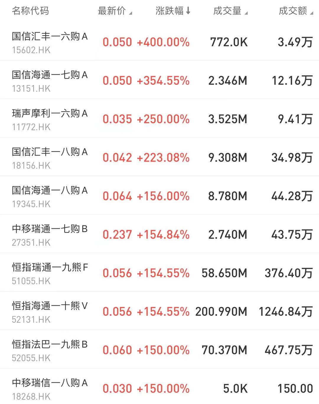 涨幅居前的包括:国信汇丰一六购A暴涨400.00%;国信海通一七购A涨354.55%。其中,中国电信大涨逾11%,超六只购证涨幅在100%以上。