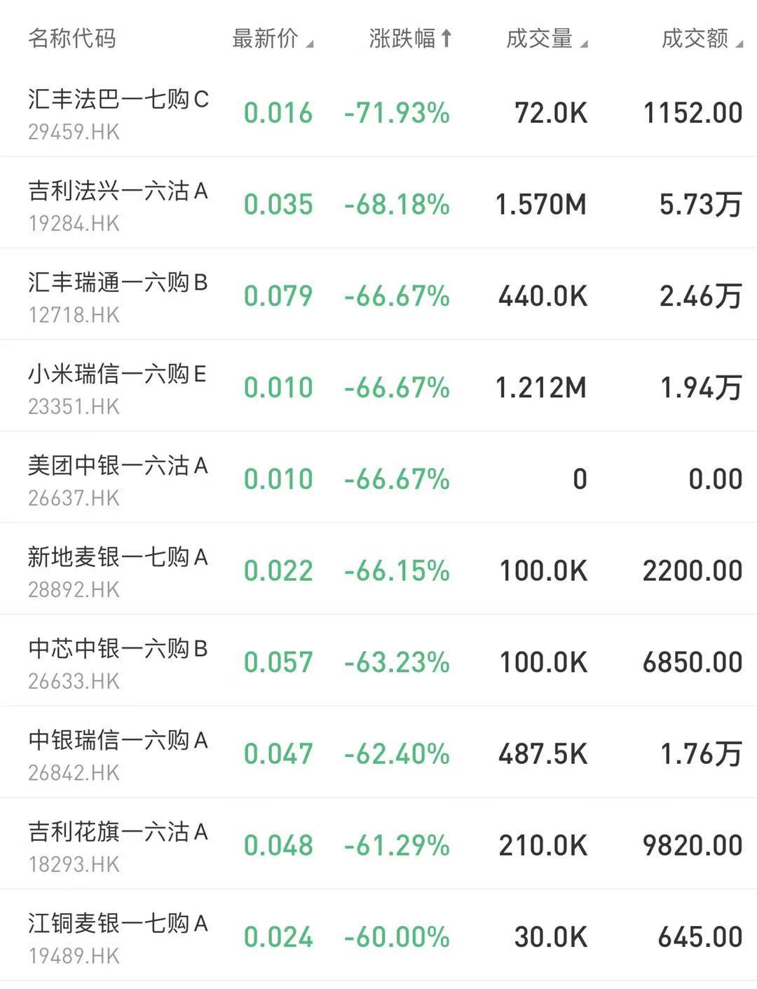 在今日跌幅榜中,汇丰法巴一七购C跌71.93%;吉利法兴一六沽A跌68.18%。