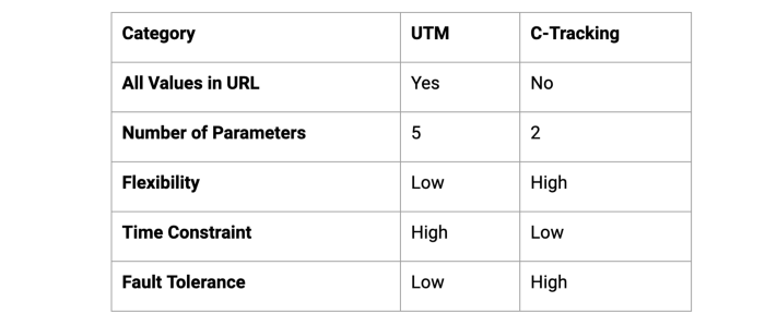 UTM跟踪URL的五个变体,包括utm_source, utm_campaign, utm_content, utm_term。对于不同的营销活动,UTM要求所有参数都要预先定义。为了解决同样的问题,C-Tracking只需要将PI和PK结合起来,同时PK定义给了营销团队最好的灵活性来跟踪任何级别的活动。为了达到同样的目的,UTM跟踪需要向URL添加一个额外的参数,这在整个系统中增加了额外的复杂性。