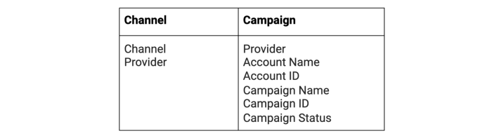 供应商元数据:关于广告平台和供应商的活动、账户和状态的详细信息。这些细节大部分,是通过各种数据摄取管道收集的。供应商元数据包含营销渠道和活动信息。