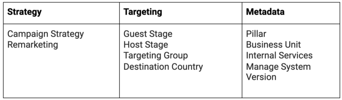 营销元数据:关于营销目的的详细信息。策略用于划分市场营销目的,如应用安装、客人/房东增长或通用品牌认知度;目标定位用于对营销活动目标进行分类,如用户群体或目的地国家;元数据是关于营销活动的所有其他元信息,如内部CMS(活动管理系统)相关数据,活动时间,版本等。