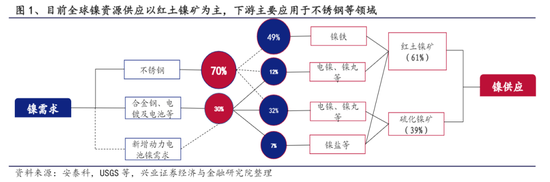 如果按含镍量来分,又分为一级镍和二级镍,前者主要用于生产电池、电镀以及合金等产品,后者主要用来生产不锈钢,从下游消费结构来看,目前不锈钢是镍的最大下游市场,占总消费的70%,动力电池虽然增长迅猛,但只占比5%左右。