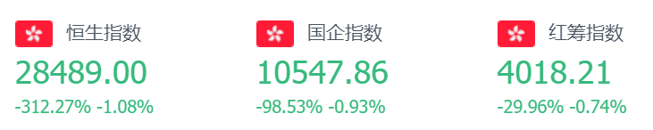周一(6月21日),港股三大指数全线收跌,市场整体情绪表现低迷。截至收盘,恒指跌1.08%报28489点,国指跌0.93%报10547点,红筹指数跌0.74%报4018点。