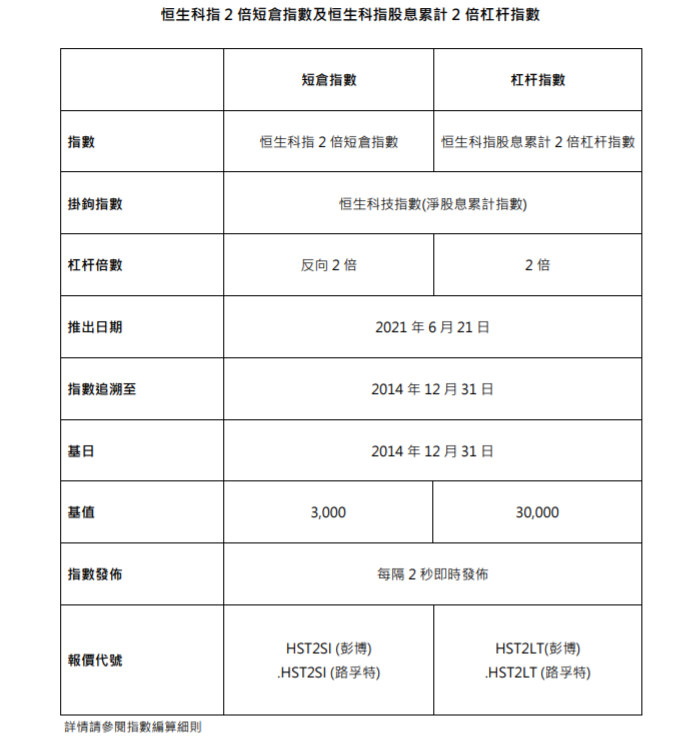 恒生指数公司推出恒生科指2倍短仓指数及恒生科指股息累计2倍杠杆指数。恒生科指2倍短仓指数与恒生科指的每日走势反向挂钩,并提供2倍反向回报;而恒生科指股息累计2倍杠杆指数则反映恒生科指股息累计指数的2倍放大回报。
