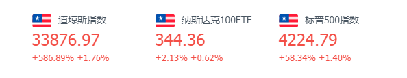 周一(6月21日),道指涨586.89点,或1.76%,报33876.97点;纳指涨111.10点,或0.79%,报14141.48点;标普500指数涨58.34点,或1.40%,报4224.79点。