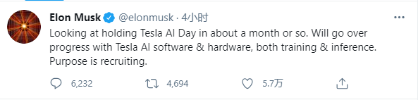 特斯拉CEO马斯克周一在推特上表示,他正考虑在大约一个月后举办特斯拉人工智能日,该公司将在这一天展现其人工智能软件和硬件方面的进展,包括训练和推理,而活动目的在于招募新员工。