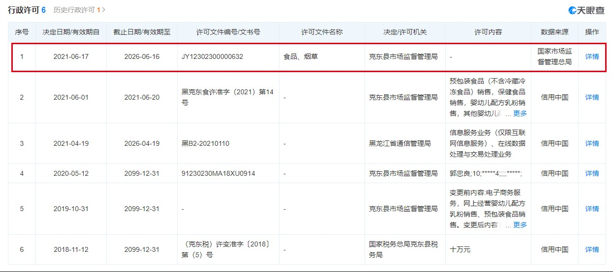 天眼查App显示,6月17日,中国飞鹤关联公司黑龙江飞鹤电子商务有限公司新增一则行政许可信息,许可文件名称为食品、烟草,有效期至2026年6月16日,许可机关为克东县市场监督管理局。