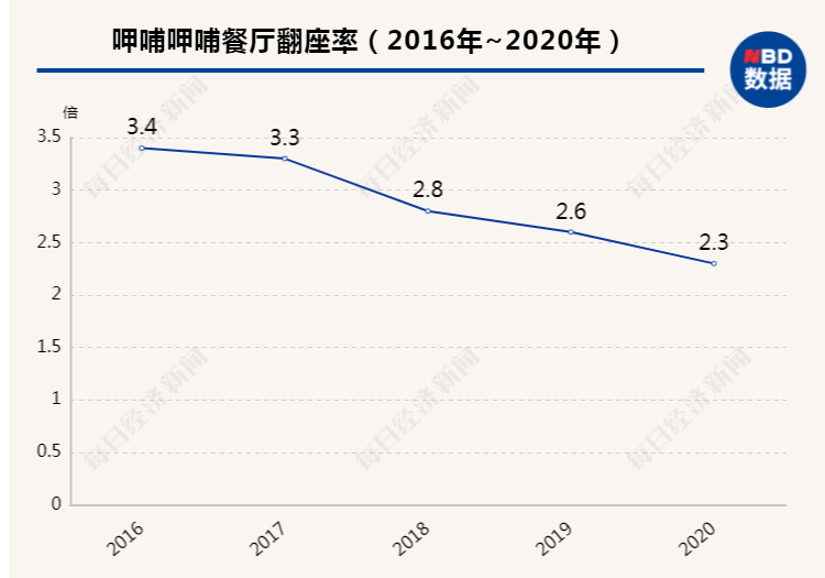 对于李磊口中的“数据下降”,记者查询历年年报发现,呷哺呷哺从2016年到2020年,餐厅的翻座率分别为3.4倍、3.3倍、2.8倍、2.6倍、2.3倍。Choice数据显示,2017年至2020年,呷哺集团营收分别增长32.84%、29.21%、27.38%、-9.53%;2017-2020年销售净利率分别为11.47%、9.76%、4.82%、0.21%。