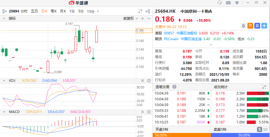 相关涡轮方面,中油摩利—十购A涨55%,其行使价为3.89港元,到期日为2021年10月5日,溢价12.29%。