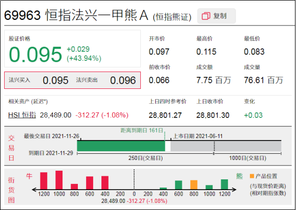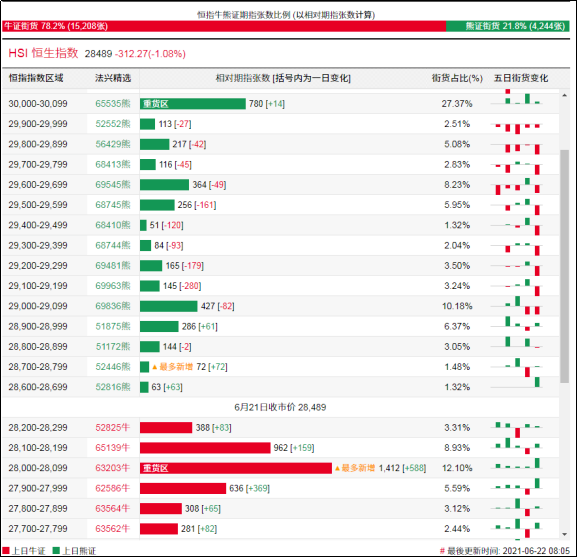 街货分布方面,至周一,恒指牛证街货贴价区间主要在收回价27900点至28300点之间,累计相当约3398张期指合约;恒指熊证街货在收回价29600点至30100点,累计相当约1590张期指合约。