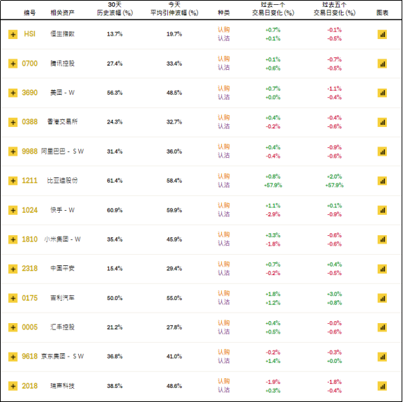 周一恒指相关权证的平均引伸波幅报约19.7%。个股方面,小米、吉利等相关认购证的引伸波幅按日调升显著;相反,快手相关认沽证的引伸波幅则按日显着调降。