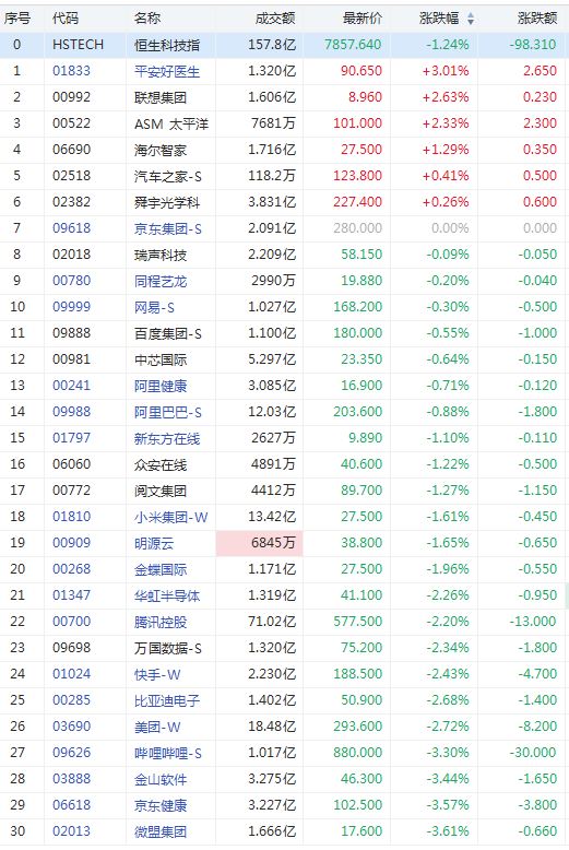 平安好医生涨3%,ASM太平洋、联想集团涨超2%;海尔智家涨超1%。