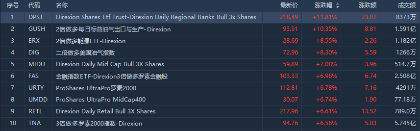 具体表现在ETF上,涨幅居前的主要有Direxion Shares Etf Trust的DPST涨11.81%,成交额8373万美元;金融指数ETF-Direxion3倍做多罗素金融股的FAS,成交额2.51亿美元。